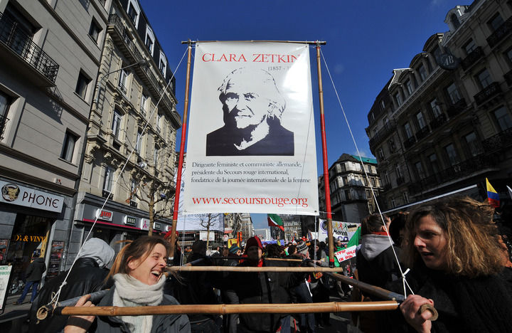 2010年3月6日,在比利时首都布鲁塞尔,妇女代表带着著名政治女性活动家、国际妇女节倡导者克拉拉·蔡特金的照片参加庆祝国际妇女节的游行。照片o 新华社记者 吴伟